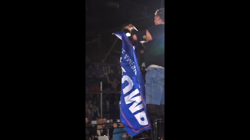 Pro Wrestler Sid Eudy (aka Sid Vicious / Sid Justice / Psycho Sid) crumples up Trump Flag and crams it down Opponents Mouth